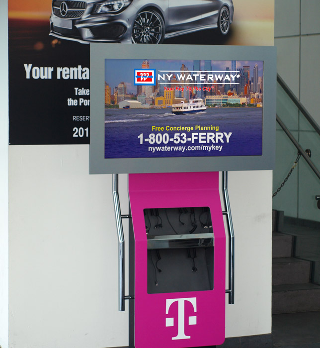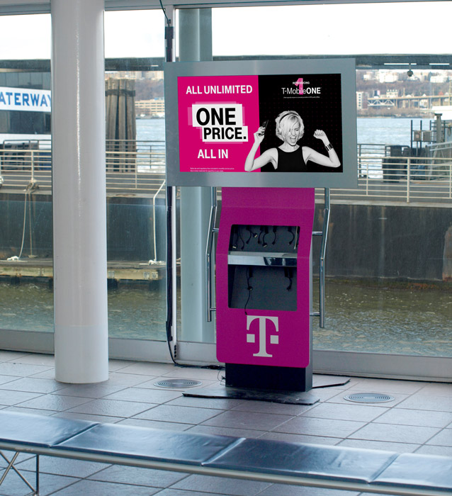 Cross River Network (CRN) is the NY metro region’s premier company providing digital advertising exclusively to the NY Waterway ferry terminals. With deployments in Belford, Weehawken, Hoboken, and Edgewater, New Jersey and at Pier 79 at 39th St in Manhattan, NY, CRN – in partnership with T-Mobile – was looking to add a unique element to their offerings. With the introduction of T-Mobile ONE, the wireless carrier sought to increase their market presence with an aggressive, full-scale media presence that was both innovative and which brought utility to their target clients. Magnetic 3D was the launch partner and four advertising-supported phone charging stations were positioned in Port Imperial and Midtown (Pier 79) to give passengers a needed boost while in the terminals. The Glasses-Free 3D displays added a unique element to a DOOH campaign that catered to over 575,000 monthly commuters and which produced 1M+ Monthly Network Impressions.